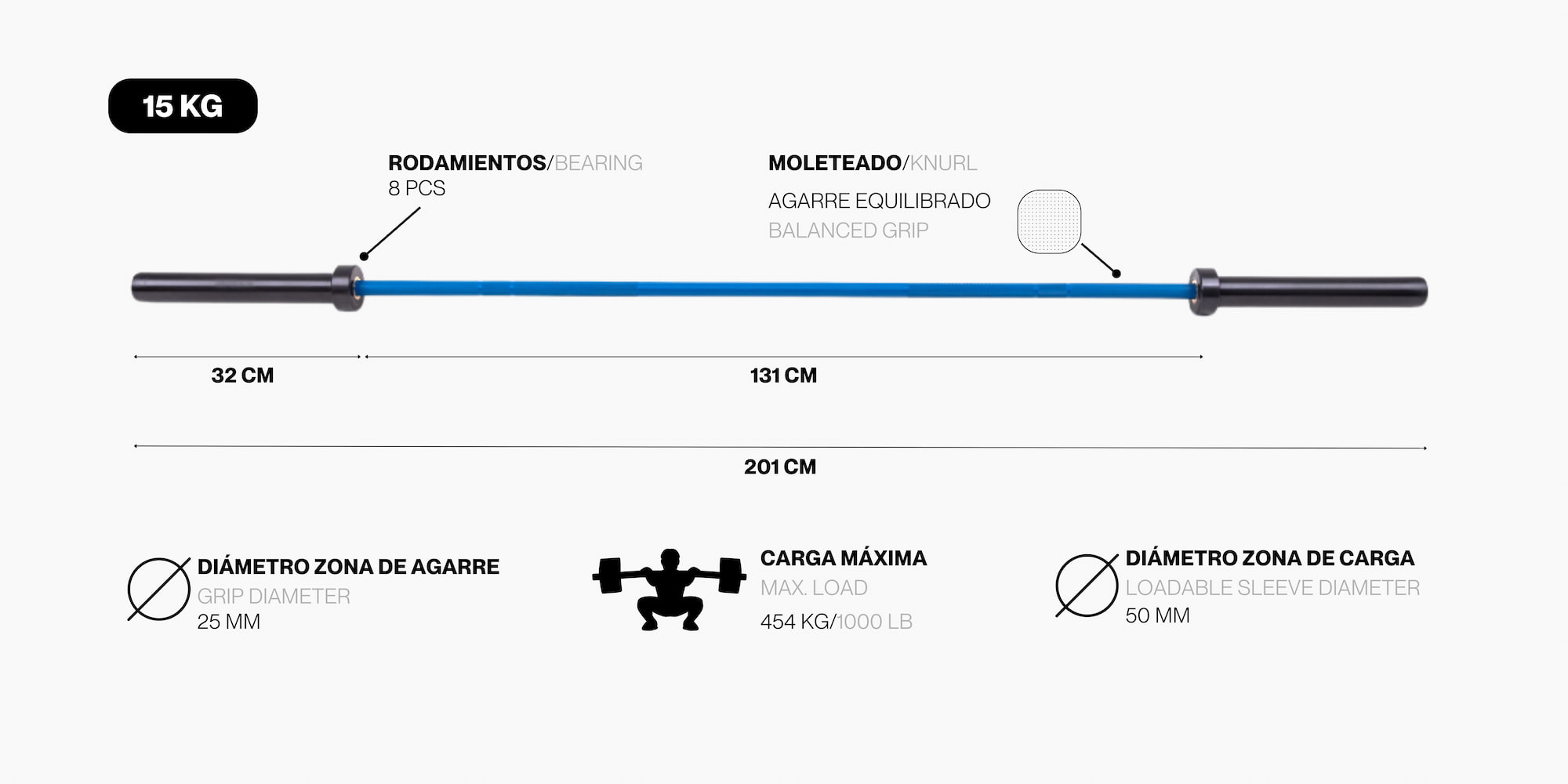 Equipadas con 8 rodamientos de agujas y 2 casquillos de bronce, proporcionan un giro suave y estable, reduciendo la tensión en muñecas y facilitando movimientos técnicos. El moleteado estándar IWF de 1,2 mm ofrece un agarre seguro y cómodo en todo tipo de levantamientos.